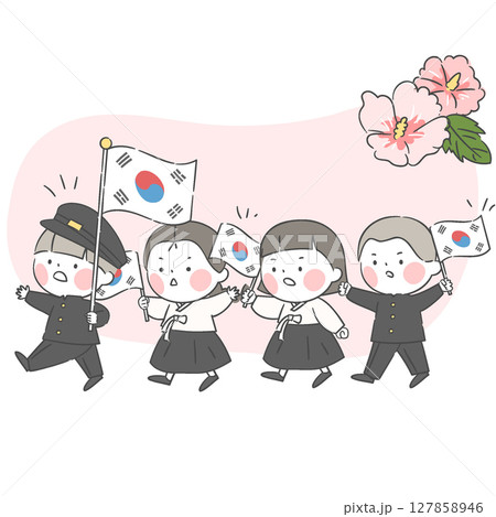 Illustration of students waving the national flag of korea(Taegeukgi)