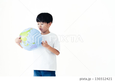男孩站在草地上,手裡拿著地球儀(2 歲,日本,無臉)