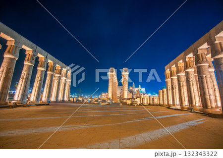 Tourists Visiting the Pylon and Courtyard of Luxor Temple at Night, Egypt.