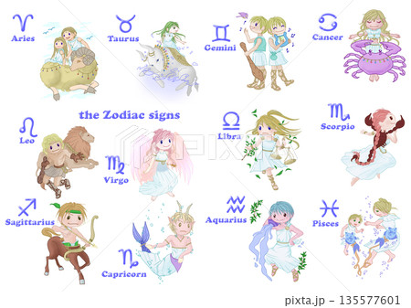 可愛多彩的十二生肖圖示集:牡羊座、金牛座、雙子座、巨蟹座、獅子座、處女座、天秤座、天蠍座、射手座、摩羯座