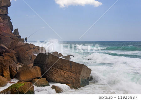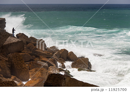 A fisherman standing on the rocks surf casting in the white waves on the Antlantic coast.