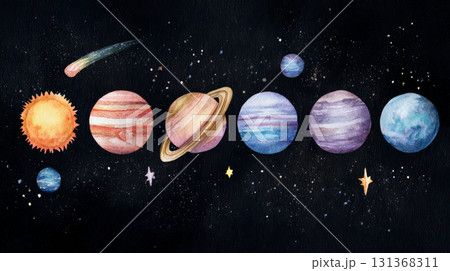 Watercolor solar system, sun, planet, comet, star, and galaxy on dark space background, whimsical and dreamy illustration