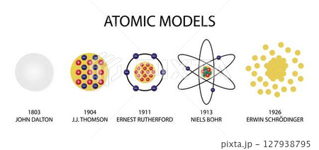 illustration of chemistry, Atomic Models History Infographic Diagram including Democritus Dalton Rutherford Bohr Schrodinger atom structures, Atomic models
