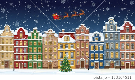 一幅北歐風格的聖誕插畫背景,描繪了聖誕老人的雪橇在夜空和滿月下飛翔,一排紅色的房屋和白雪皚皚的景色。