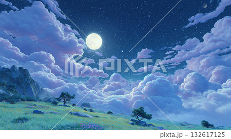山坡上的樹木和夜空中的雲:奇幻插畫