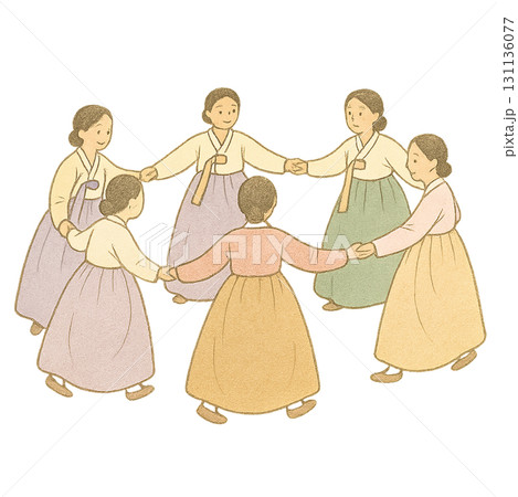 ganggangsullae, traditional play, folk dance, women, holding hands, circle dance, moonlight, night sky, custom, holiday, together, singing, ancestors, Chuseok, heritage, culture, harmony, unity, full