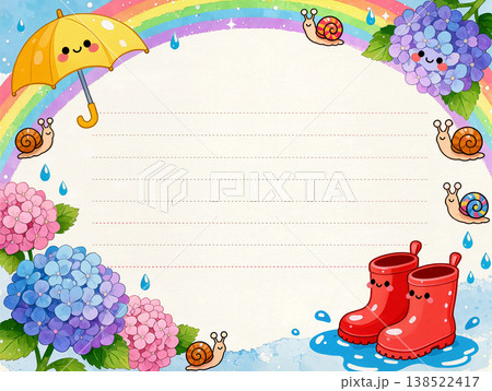 以繡球花、彩虹、雨季、蝸牛、雨傘和雨靴為主題的文具。