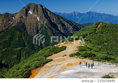 登山者們在八嶽山脈的魚尾岳、橫岳、赤岳、阿彌陀岳以及南阿爾卑斯山脈的山頂上攀登。