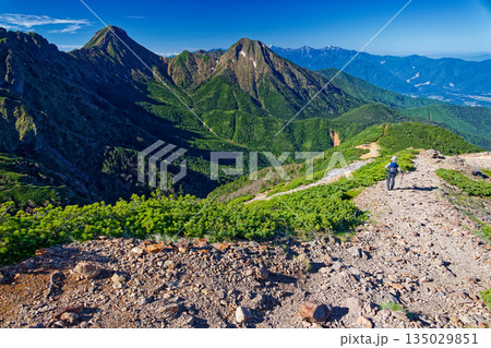 從通往赤石小屋的岔路口可以看到赤石山頂峰的景色。南阿爾卑斯山、赤石山攀登