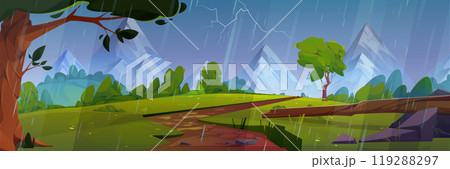 Storm and rain landscape with park on waterfront