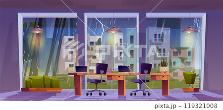 Company office interior in rainy weather