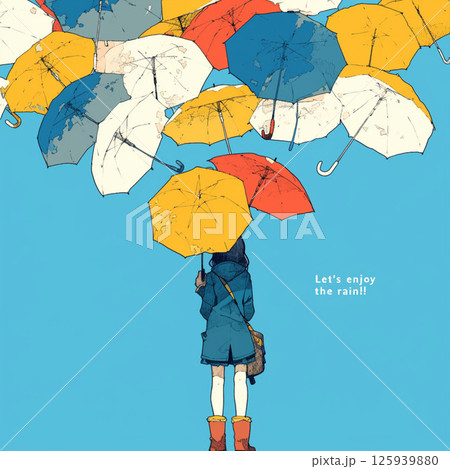 許多雨傘和“讓我們享受雨吧!!”的字樣。