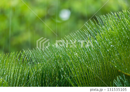 雨天:水滴落在濕潤的蘇鐵葉上,閃閃發光。