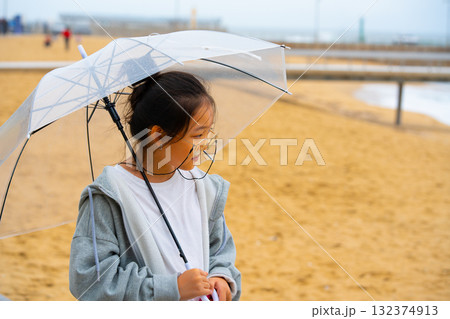 Asian girl in glasses with umbrella on the shore of the eastern sea