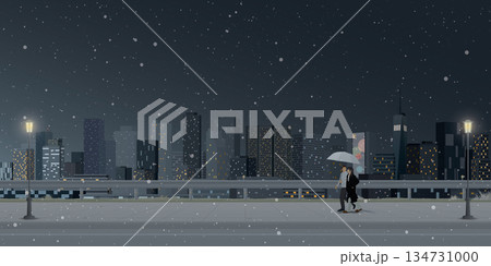 Cityscape in winter season at night with couple of lover under umbrella walking on the sidewalk have skyscraper and night sky background graphic illustration.