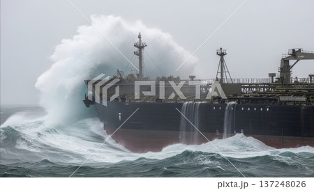 Large oil tanker ship battling massive ocean waves during severe storm with dramatic water spray and industrial maritime vessel in rough seas