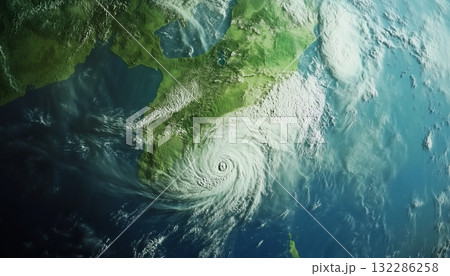 Vast swirling storm system over ocean, showcasing environmental impact and intensity