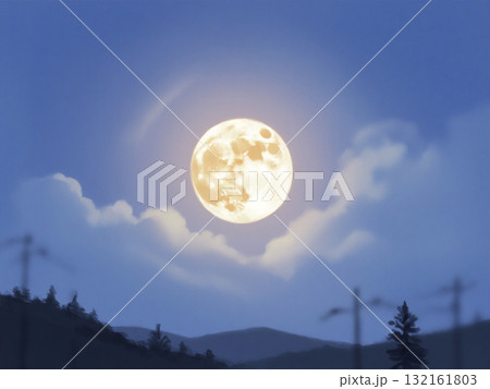 一輪圓月閃耀在夢幻般的夜空中,一幅夢幻般的風景畫
