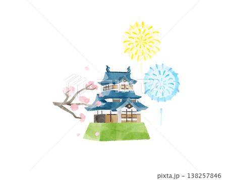 城堡、櫻花、煙火、水彩插畫、可愛、風格化、夜櫻、煙火表演、春天、夏天、觀光、材料