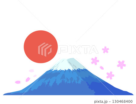 富士山與冉冉升起的太陽和櫻花翩翩起舞的插圖