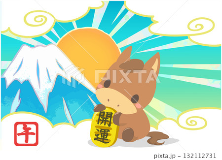 新年材料2026年馬和橢圓形硬幣富士山和初升的新年賀卡
