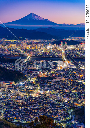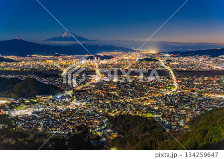 從忍野/富士山看到的南阿爾卑斯山的日出和富士吉田/河口湖市的夜景。