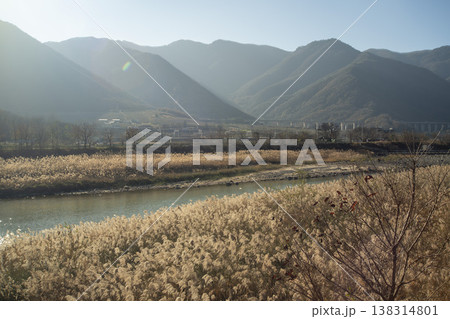 富士山,晨曦灑在樹林中枯萎的日本蒲葦上,周圍籠罩著晨霧。