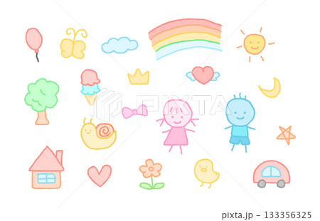 Happy sun rainbow red monster blue pencil cartoon doodle playful colorful Playful cartoon doodle