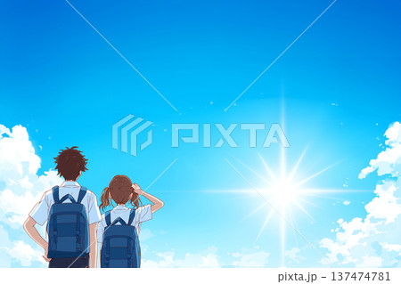 背著書包的男男女女學生背對著鏡頭,沐浴在明媚的陽光和蔚藍的天空下,心中懷抱著對未來的希望與夢想。