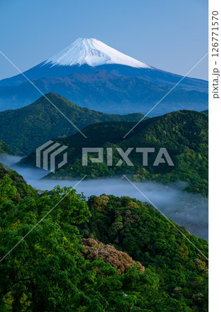 從丹澤的檜木丸眺望富士山和山中湖的晨霧
