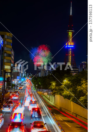 用一種顏色的神宮外苑煙花比賽的橙色繪製美麗的拋物線的煙花