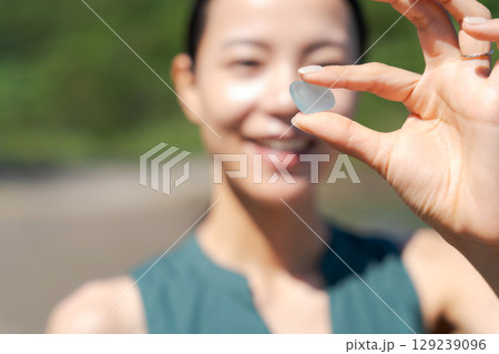 一名婦女在海灘上撿拾海玻璃