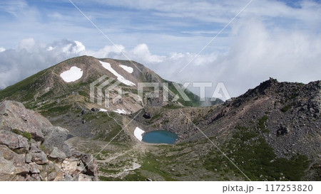 北阿爾卑斯山冷池附近吉賀岳的登山者和積雪
