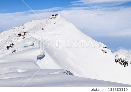 冬季,登山者和站在八嶽山脈橫岳主峰上的火內山