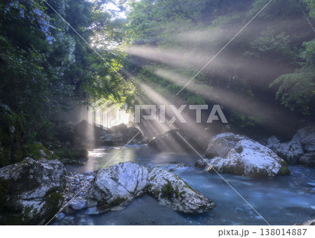 乘鞍高原的夏季,光線照射在三本瀑布上