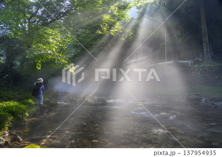 美麗的光線出現在菊池山谷(熊本縣菊池市,豎幅構圖)