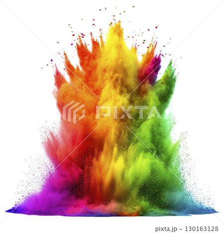 A vibrant explosion of colorful powder creates dynamic and energetic display, featuring spectrum of hues including red, orange, yellow, green, blue, and purple