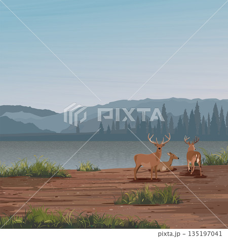 Minimalism landscape of muddy area with deer pack, lake, pine forest and mountain ranges graphic illustration have blank space at blue sky.