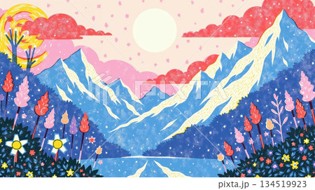 Serene colorful illustration of an abstract landscape with mountain, nature, and beautiful drawing of sun