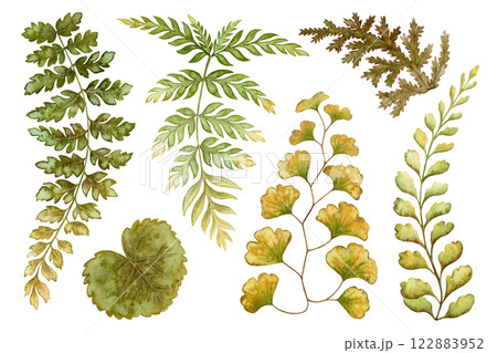 Set of fern leaves textured botanical illustration in earth tone. Hand drawn watercolor floral element of prehistoric plant. Perfect for the use of ecological material and sustainable designs.