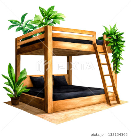 Cozy and Inviting Wooden Bunk Bed Surrounded by Lush Green Plants in a Bright Space