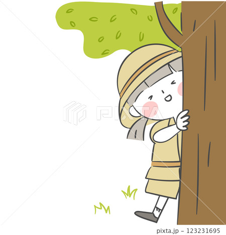 Illustration of an explorer hiding behind a tree