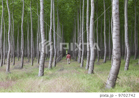 A man in a forest of poplar trees, Oregon, USA.