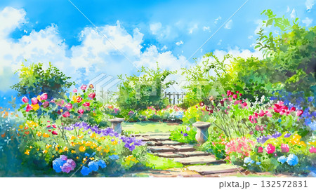 手繪春日插畫,描繪了繁花盛開的草地,陽光透過樹木灑下斑駁的光影,櫻花和野花點綴其間,藍天白雲,粉紅色和黃色的花海環繞,構成一幅柔和寧靜的自然畫卷。