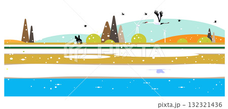 冬季草地、河流和森林風景的生態永續景觀插圖