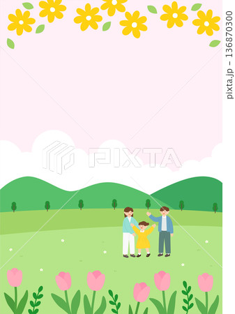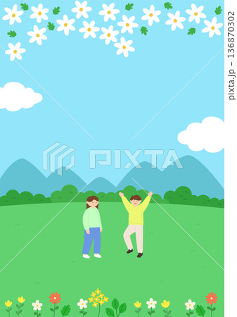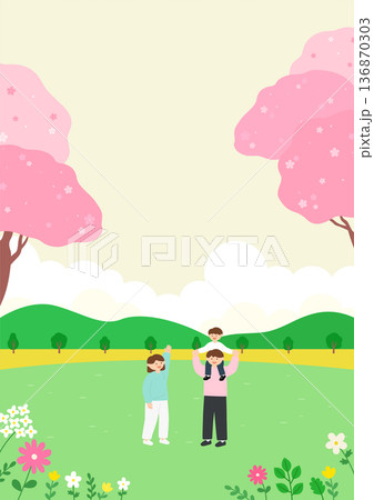 春日插畫,描繪了人們奔跑在櫻花和油菜花盛開的田園風光中。
