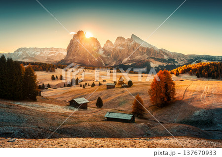 Sunrise over Alpe di Suisi with Sassolungo and Sassopiatto mountian peak on grass hill in Dolomites