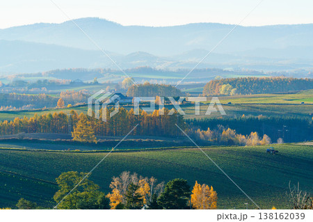 美瑛山丘和周圍群山環繞,秋葉色彩斑斕,構成了一幅美麗的秋日景觀。