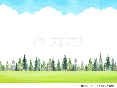 水彩風格的草地和藍天風景插畫帶有小房子的背景材料