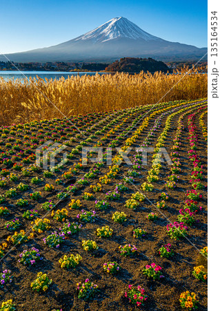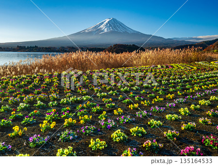 從大石公園眺望三色堇花田和白雪皚皚的富士山